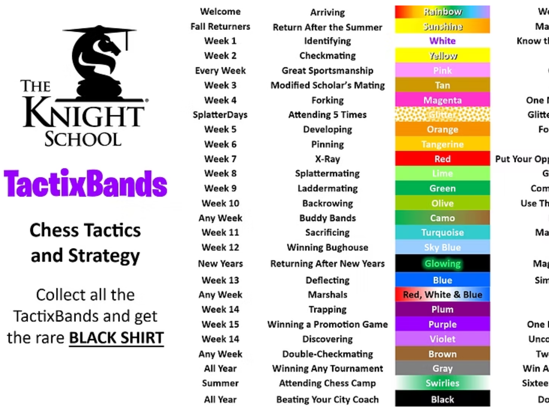 T-Shirt, chess set, chess bag, and all the colorful TactixBands they can earn!